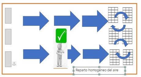 El movimiento del aire debe tener una velocidad de 14 a 20 metros/minuto, de fácil medición con un anemómetro portátil. La lectura debe hacerse en varios puntos de la cámara, pasillos, espacio entre filas de palets, y zona libre de entrada, con la fruta estocada.
