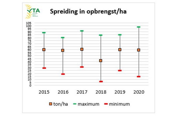 La amplia distribución dificulta la determinación de un buen promedio. Para las cebollas amarillas, el rendimiento en las empresas de las provincias del norte de Países Bajos es de 15 toneladas por hectárea más alto que en las del sur del país. Para las cebollas rojas, la diferencia es de 6,5 toneladas por hectárea. Estas diferencias se explican por el impacto desigual del invierno húmedo, la primavera difícil con un largo período de sequía, las olas de calor y las fuertes lluvias y granizadas registradas a nivel local, además del hecho de que no todas las empresas tienen la misma capacidad de riego.