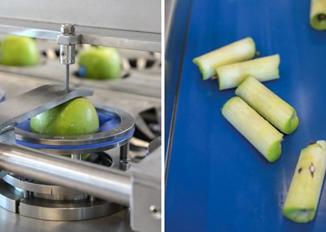Cada fruta se corta en hasta 20 gajos. El proceso se lleva a cabo de forma completamente automática; el operador solo tiene cargar las manzanas en el tanque. Los trozos obtenidos pueden someterse a un tratamiento para evitar que adquieran una tonalidad marrón.