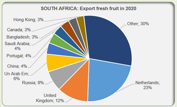 Este año, el 23% del las exportaciones de fruta de Sudáfrica se destinaron a los Países Bajos (810.000 toneladas), mientras que un tercio de los envíos llegaron a la UE-27 en su conjunto. Ya que las exportaciones directas a Italia, Alemania y España disminuyeron, el crecimiento de las exportaciones a la UE-27 fue de “solo” un 16%. Por otro lado, los envíos directos a Portugal aumentaron considerablemente. El Reino Unido es el segundo mayor comprador de fruta sudafricana con 425.000 toneladas, un 15% más que en 2019.