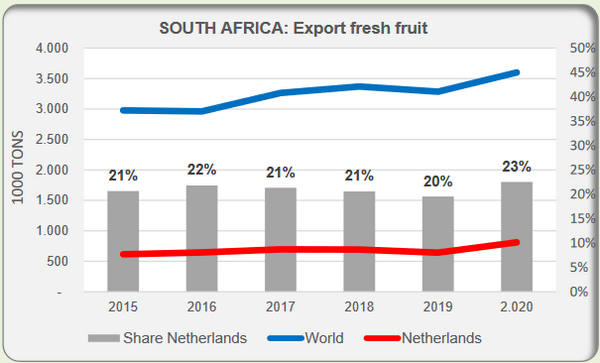 Existen diferencias considerables en la evolución de las exportaciones a los distintos países de destino. Países Bajos siempre ha sido el principal comprador de fruta sudafricana y este año, según la Aduana sudafricana (SARS), las exportaciones a ese país han aumentado en un 25% con respecto al año pasado y en un 17% respecto a los dos años anteriores. Las cifras de importación holandesa según Eurostat confirman este incremento.