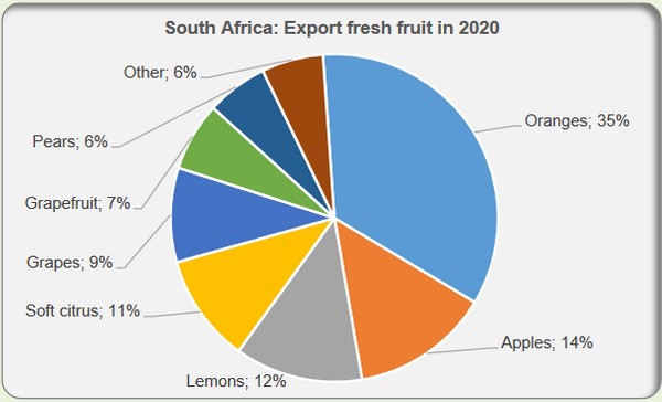 Las naranjas representan más de un tercio de las exportaciones de frutas de Sudáfrica. Las exportaciones de naranjas crecieron un 6%, por debajo de la media. Sudáfrica exportó 1,25 millones de toneladas de naranjas este año, más que en 2019 (1,18 millones de toneladas) pero menos que en 2018 (1,27 millones de toneladas).