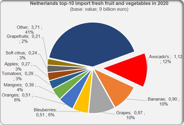 En 2020 el aguacate ha sido el producto más importante en el segmento de las frutas y hortalizas frescas importadas por Países Bajos. Con un valor de importación de nada menos que 1.100 millones de euros, el aguacate representó el 12% del total de las importaciones holandesas de frutas y hortalizas frescas, que en 2020 ascendieron a 9.000 millones de euros. Hace diez años, el aguacate ocupó el décimo lugar con unos 100.000 euros de un total de 3.800 millones de euros. Una vez tenidos en cuenta los efectos de la inflación, esta cantidad equivaldría actualmente a más de 4.500 millones de euros. Otro producto que ha escalado posiciones es el arándano. En 2020, el valor de importación de este producto ascendió a 500 millones de euros. Esto coloca a los arándanos en la quinta posición en el ranking de importaciones holandesas de frutas y hortalizas.