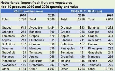 Las mandarinas, los melones y las peras han caído de la lista de los diez productos de importación más importantes en Países Bajos. Sin embargo, en 2020 se importaron más mandarinas que en 2010. En diez años, las importaciones holandesas (incluidas las reexportaciones) han crecido más de un 85%. Los recién llegados son los arándanos, las cebollas y los mangos.