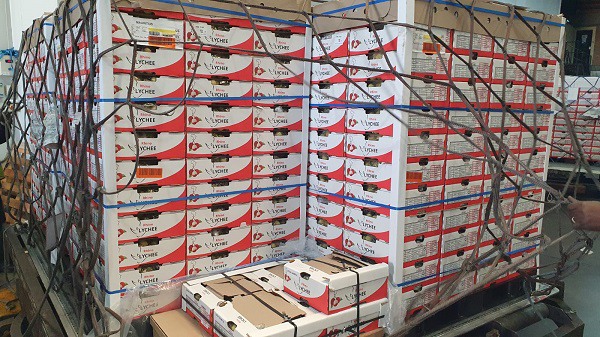 Un palé de lichis para su envío a EE. UU. en avión (foto facilitada por Ben Halliday)