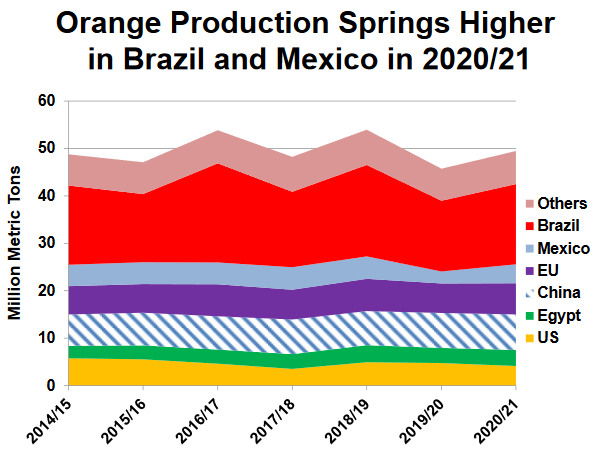 El Departamento de Agricultura de EE. UU. estima que la producción mundial de naranjas en 2020/2021 aumentará en 3,6 millones de toneladas con respecto a 2019/2020, hasta alcanzar 49,4 millones de toneladas. El tiempo favorable ha llevado a un aumento de las cosechas en Brasil y México, compensando la disminución de producción en Turquía y los Estados Unidos.