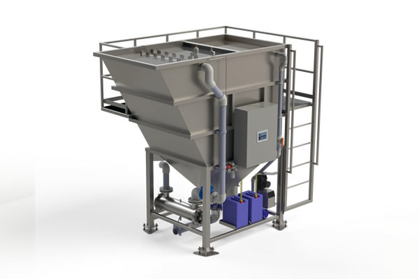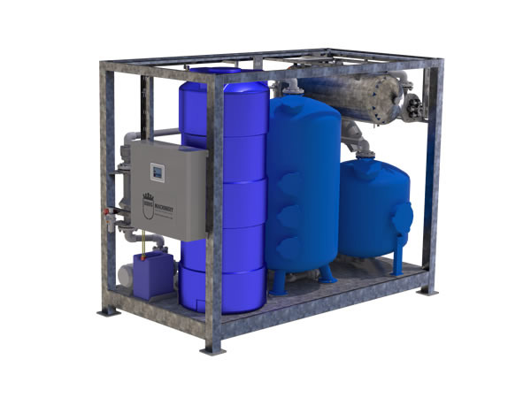 La instalación BLS-6 (filtro de láminas) funciona mediante prefiltrado con dosificación de floculante y las láminas filtran 6 metros cúbicos por hora. La máquina tiene también un sistema de desinfección UV.