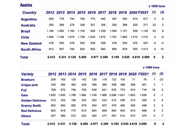 En lo que respecta a las manzanas, la previsión de la cosecha agregada del hemisferio sur para 2021 sugiere un aumento del 6% (5.090.000 toneladas) en comparación con el año pasado (4.818.000 toneladas), con aumentos en Australia, Brasil y Sudáfrica del 23%, 20% y 6% respectivamente, una disminución en Nueva Zelanda del 5%, y cifras estables en Argentina y Chile. El agregado ha aumentado un 2% en comparación con el promedio de las cosechas entre 2018 y 2020. Chile sigue siendo el mayor productor de manzanas del hemisferio sur en 2021 con 1,512 millones de toneladas, con Brasil en segundo lugar (1,130 millones de toneladas), seguido de Sudáfrica (1,013 millones de toneladas), Argentina (617 millones de toneladas), Nueva Zelanda (547 millones de toneladas) y Australia (271 millones de toneladas). La variedad Gala sigue siendo la principal (39%), seguida de la Fuji (14%) y la Red Delicious (13%). Se estima que las cifras de exportación se estabilizarán en 1.691.562 toneladas, con cifras estables en Chile (650.773 toneladas), un aumento del 4% en Sudáfrica (476.000 toneladas), y un descenso del 7% en Nueva Zelanda (372.000 toneladas).