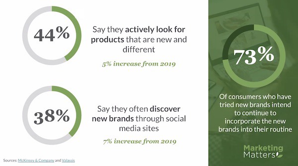 Los consumidores se han visto atrapados en casa y privados de muchas de sus formas habituales de entretenimiento durante casi un año, y ahora más que nunca están probando nuevas marcas y productos. "En una encuesta reciente, el 44% de los encuestados decía estar buscando nuevas marcas y productos para animar su día a día, y el 73% afirmaba tener la intención de seguir incorporando estas nuevas marcas y productos en sus rutinas. Dado que casi la mitad de los consumidores busca nuevas marcas y productos, ahora es el momento de comunicarle al consumidor de manera clara y eficaz el valor de tu marca y de tus soluciones de producto. Esto se puede hacer de varias maneras, desde renovar la fotografía, crear un blog o ampliar el alcance de las cuentas en las redes sociales hasta invertir en publicidad", dice Mackey Almy.