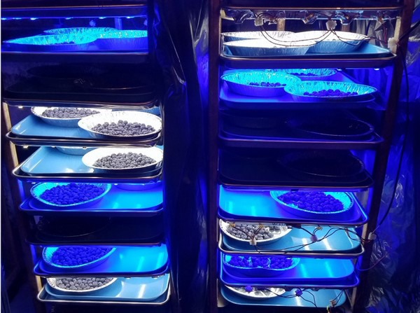 Los arándanos, después de la cosecha, se sometieron a pruebas con luz azul para determinar si la luz afectaba a la calidad de la fruta o al desarrollo de enfermedades. Imagen: Universidad de Georgia