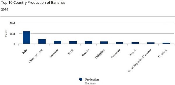 India es el mayor productor de bananas del mundo. En 2019, su volumen se situó en cerca de 30,5 millones de toneladas, lo que representó el 26,02% de la producción mundial. Esta fruta se consume principalmente a nivel nacional. Las exportaciones son limitadas o no están nada desarrolladas, especialmente las destinadas a Europa.