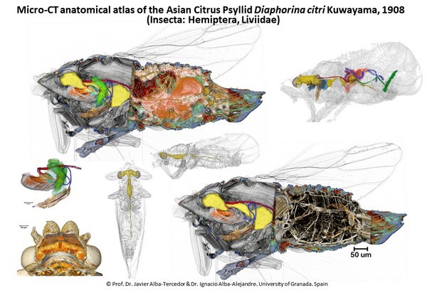 Científicos de la Universidad de Granada han realizado el primer atlas anatómico de un diminuto insecto de apenas 3 milímetros denominado Diaphorina citri, el psílido asiático de los cítricos (ACP), responsable de las mayores pérdidas económicas en los cultivos de cítricos de todo el mundo.