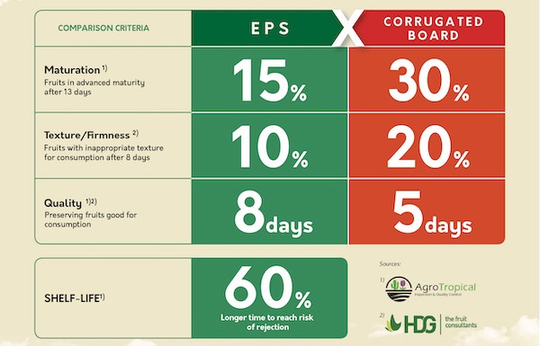 En el desarrollo de soluciones de conservación de EPS con la marca DaColheita (FarmFresh en el mercado internacional), Termotécnica ha estado trabajando con productores y comerciantes socios para contribuir al crecimiento de la cuota de mercado de las frutas brasileñas en los mercados extranjeros. El gerente general de Termotécnica, Nivaldo de Oliveira, explica: "Nuestras soluciones de conservación y nuestros palés, ambos de EPS, permiten una reducción del 70% del peso total de la carga en comparación con otros tipos de embalaje, además de ahorros significativos en gastos de envío aéreo".