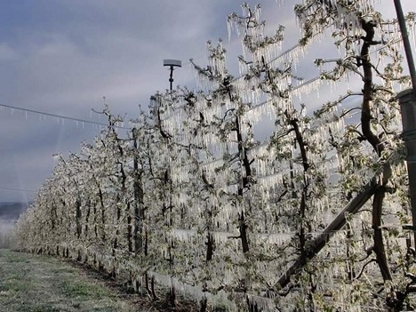 Andrea Bonn ha tomado algunas fotografías de los sistemas antiheladas del Consorzio di Denno (Trento). "En algunas zonas, la temperatura se desplomó a -7 ºC, y una pequeña parte de las plantas cuentan con sistemas antiheladas. Por desgracia, en el valle no es posible instalarlos porque falta agua".