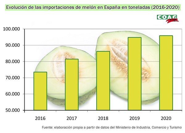 Las importaciones de melón a España han crecido un 31% entre 2016 y 2020, pasando de 73.401 t hasta las 95.792 t del pasado año. Se producen dos periodos de importación intensiva por parte de los operadores: en los meses de marzo y abril (con alrededor del 25% total anual importado), momento en el que está comenzando nuestra campaña, y luego en los tres últimos meses del año, cuando comienzan a decaer los volúmenes comercializados de nuestra producción. “De nuevo, se trata de la estrategia habitual de presionar a la baja nuestras cotizaciones en origen en el arranque de nuestra producción mediante la entrada masiva de producto y forzando la especulación. Los importadores y las cadenas de distribución comercial no tienen miramientos en perjudicar a los agricultores y agricultoras productores de melón trayendo producto de fuera de la UE, que se cultiva con condiciones mucho menos exigentes de las que cumplimos aquí”, ha señalado Góngora.