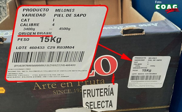 En concreto, el equipo de “vigilantes de la fruta” de COAG ha podido comprobar cómo se pone a la venta melón piel de sapo importado de Brasil, mientras en los carteles se informa al consumidor de un supuesto “origen España”. En las propias cajas del producto se puede comprobar el origen sudamericano del mismo, algo que no se traslada al consumidor, en nuevo ejemplo de falta de fiabilidad y preocupación por los clientes.