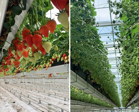 Izquierda: Fresas Malling Centenary en el invernadero. Derecha: Fresas Elsanta