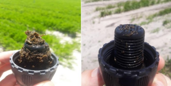 Antes del ecoSolv: Cabezal de aspersor atascado. Después de ecoSolv: Cabezal en mejores condiciones.