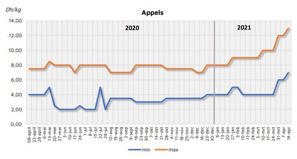 En el enlace inferior se puede acceder a un resumen actualizado de los precios mayoristas semanales de las frutas y hortalizas más vendidas en el mercado mayorista de Casablanca (Marruecos) entre abril de 2020 y la semana 15 de 2021. Los gráficos muestran los precios de venta mínimos y máximos en dírhams marroquíes por kilo, para los siguientes productos (en este orden): tomates, zanahorias, patatas, calabacines, berenjenas, pepinos, aguacates, naranjas, manzanas y bananas.