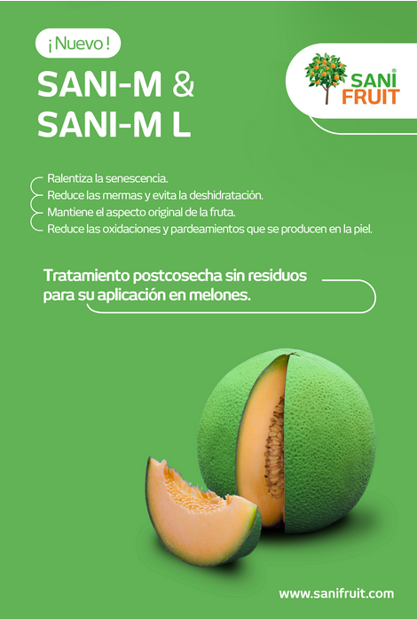 Sani-M & Sani-M L son formulados a base de extractos vegetales alimentarios, para su aplicación en drencher y en línea, que actúan como protectores para la piel del melón frente a los agentes externos, disminuyendo las mermas y evitando la deshidratación. Además, se pueden aplicar junto con dos recubrimientos con largo recorrido y demostrada eficacia: Sani-RC y Sani-RC L, para obtener mejores resultados.