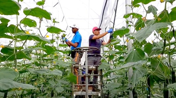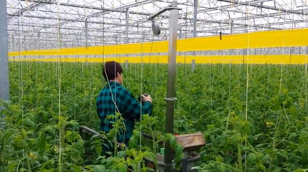 Ka-chunk. Ka-chunk. Ka-chunk. Un sonido suave y rítmico surge del carrito de transporte en un invernadero de pepinos en Alemania. El mismo sonido se escucha en un invernadero de tomates mexicano, donde un trabajador sobre zancos se sitúa entre las tomateras. Y también en España, en un invernadero de pimientos. Se trata del sonido del Tomsystem, sistema utilizado para atar las plantas mecánicamente al alambre con una pequeña anilla metálica. El sistema, que permite a un trabajador sujetar más de 2.000 plantas por hora, ofrece una solución a la falta de mano de obra disponible en el sector de los invernaderos.