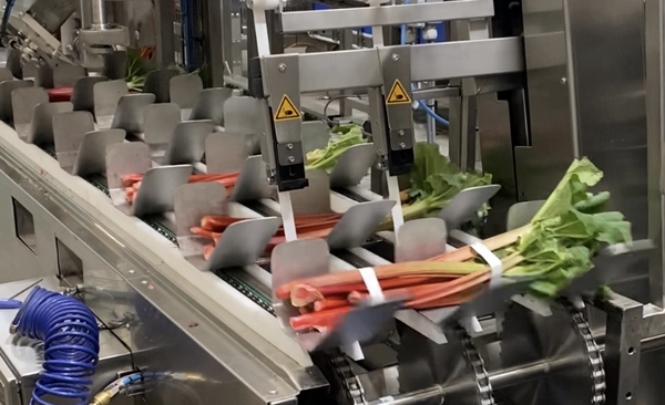 Las bandas son cada vez más populares como una alternativa de envasado más sostenible. “La demanda de envases con menos material, en particular sin film plástico, sigue siendo muy alta. Con la nueva máquina enfajadora, además de puerros y ruibarbo, también se pueden agrupar y envasar otros productos como pepino o apio”.
