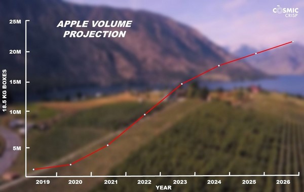 "Está previsto que el volumen de Cosmic Crisp se duplique con creces este otoño y se vuelva a duplicar en la cosecha de 2022. Ese volumen rivalizará con el de las variedades principales actuales, desplazando a las variedades antiguas que están siendo sustituidas por variedades de mayor color y sabor", explica Catherine Gipe-Stewart, directora de comunicaciones. "Cosmic Crisp está subiendo tan rápidamente, que tiene potencial de convertirse en una variedad top-5 por estas fechas el próximo año".