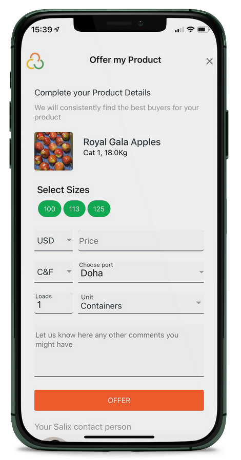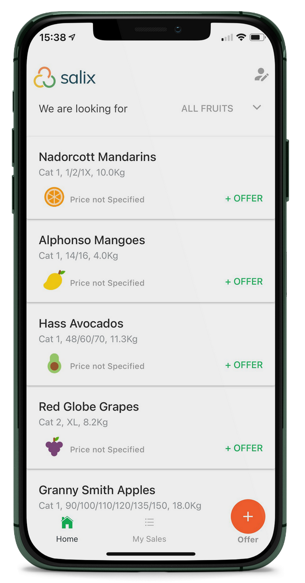 “La plataforma también les brinda a los compradores la posibilidad de realizar un pedido de algo que no está en la app, pero que nosotros nos encargaremos de conseguirlo”, explica Juan González Pita, fundador de Salix. “Solo con mover el dedo pueden ver lo que está disponible para comprar, de qué calidad, de qué grado, de qué tamaño, se puede ver la foto y de dónde viene esa fruta. Y con pocos clicks pueden hacer una oferta por ese producto”.