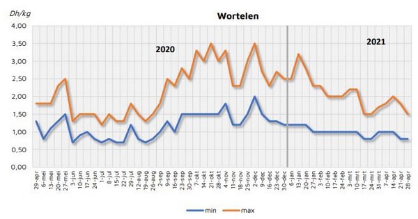 En el enlace inferior se puede acceder a un resumen actualizado de los precios mayoristas semanales de las frutas y hortalizas más vendidas en el mercado mayorista de Casablanca (Marruecos) entre mayo de 2020 y la semana 17 de 2021. Los gráficos muestran los precios de venta mínimos y máximos en dírhams marroquíes por kilo, para los siguientes productos (en este orden): tomates, zanahorias, patatas, calabacines, berenjenas, pepinos, aguacates, naranjas, manzanas y bananas.