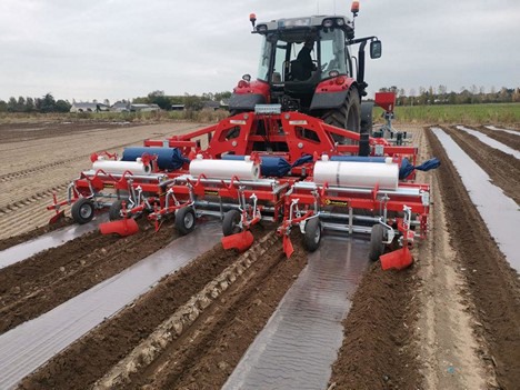 Para grandes superficies, se encuentran disponibles soluciones para acolchar 3 caballones al mismo tiempo, tanto con marcos fijos como flexibles (hidráulicos). Todos los modelos PS triples están equipados con un paralelogramo para la oscilación independiente de las máquinas, así como una junta transversal para la oscilación longitudinal y la completa adaptación al suelo.