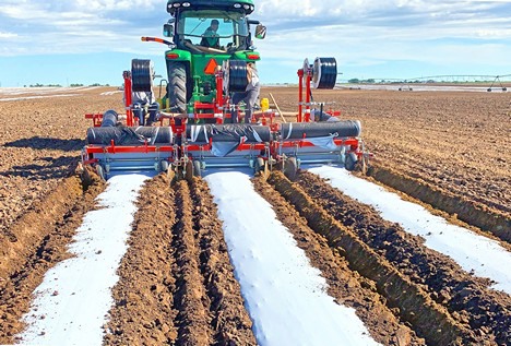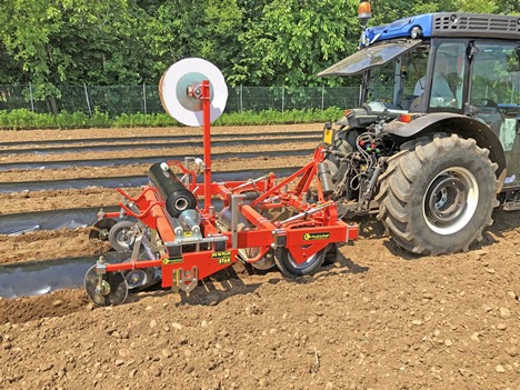 La colocación de la película se lleva a cabo mediante la acción combinada de entablonadura del terreno mediante rejas orientadoras delanteras, la colocación de la película mediante ruedas y la aporcadura de ella mediante rejas orientadoras traseras. Las ruedas prensapelícula de convergencia e inclinación ajustables permiten trabajar de forma rápida y con excelentes resultados, incluso en bancales de altura media previamente preparados.