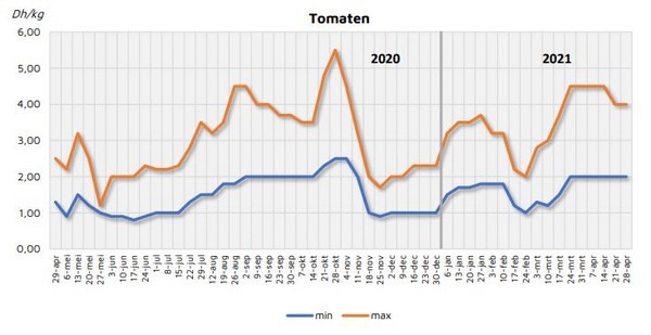 En el enlace inferior se puede acceder a un resumen actualizado de los precios mayoristas semanales de las frutas y hortalizas más vendidas en el mercado mayorista de Casablanca (Marruecos) entre mayo de 2020 y la semana 18 de 2021. Los gráficos muestran los precios de venta mínimos y máximos en dírhams marroquíes por kilo, para los siguientes productos (en este orden): tomates, zanahorias, patatas, calabacines, berenjenas, pepinos, aguacates, naranjas, manzanas y bananas.