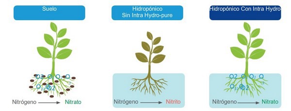 El oxígeno es fundamental para un desarrollo sano de las plantas. Aunque las plantas generan oxígeno como producto derivado durante la fotosíntesis, necesitan oxígeno para producir energía durante la noche. Además, las raíces de una planta necesitan oxígeno para desarrollarse adecuadamente y las bacterias de la rizosfera emplean el oxígeno para convertir el nitrógeno en nitrato y amoniaco biodisponibles. En el suelo, las raíces obtienen el oxígeno de las burbujas de aire existentes entre las partículas del suelo; pero en los sistemas hidropónicos los niveles de oxígeno pueden reducirse rápidamente por debajo del nivel necesario de 8 mg/l.