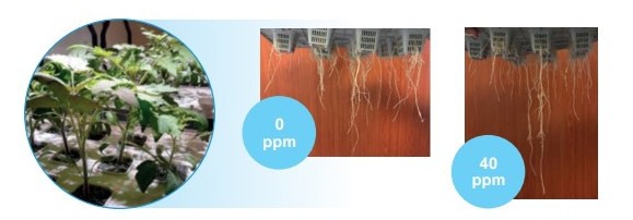 Las plantas cultivadas en el agua y sin Intra Hydro-pure tenían un aspecto comparable, pero las raíces cultivadas en 40 ppm de Intra Hydro-pure eran visiblemente más largas.