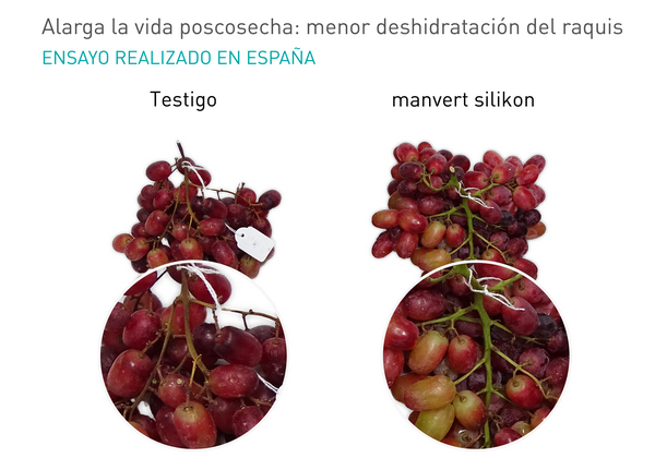 En uva la aplicación de manvert silikon se hace evidente en una notable reducción de la deshidratación del raquis y del desgrane.