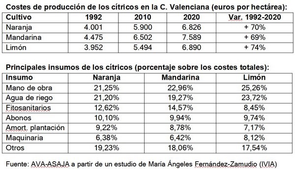 La Asociación Valenciana de Agricultores (AVA-ASAJA) revela, a partir de los datos del estudio ‘La citricultura valenciana, la evolución de sus costes de producción e insumos que los determinan’ publicado por María Ángeles Fernández-Zamudio, del Instituto Valenciano de Investigaciones Agrarias (IVIA), que los costes de producción de los cítricos en la Comunitat Valenciana han aumentado un 70% durante los últimos 30 años (1992-2020).