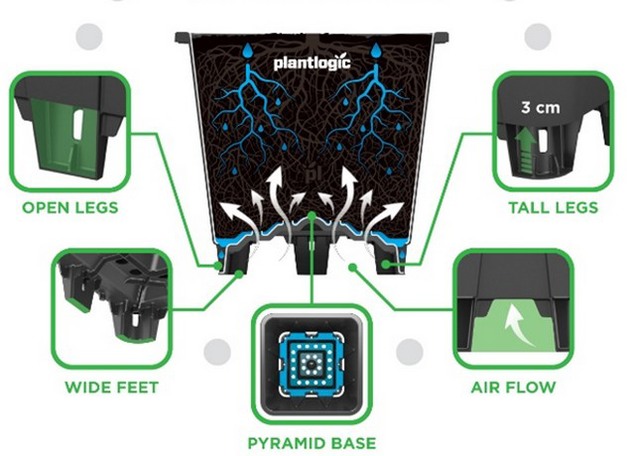 Las macetas y contenedores de Plantlogic tienen las patas más altas del mercado con zonas específicas para el drenaje, y agujeros específicos para la absorción de oxígeno. Las patas y los más de 30 agujeros en el fondo de las macetas permiten que el aire fluya por debajo de la planta manteniendo sana toda la zona radicular.