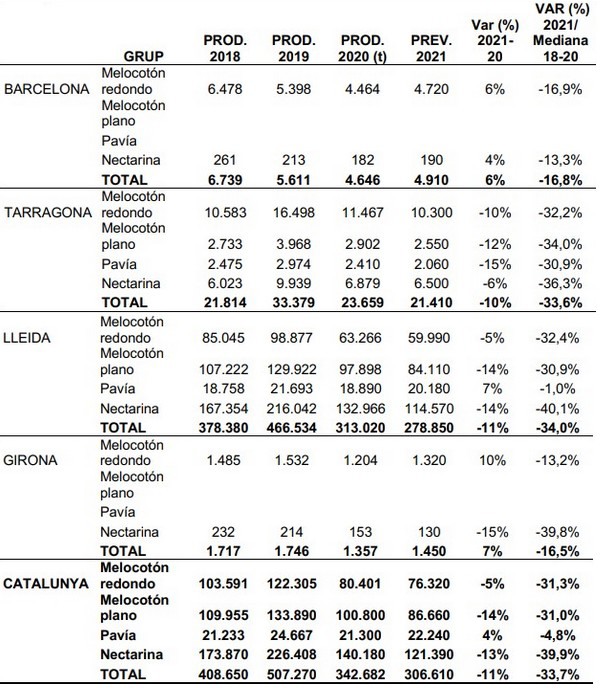 Tabla. Previsión de cosecha 2021 y producción 2018-2020 de melocotón y nectarina en Cataluña.
