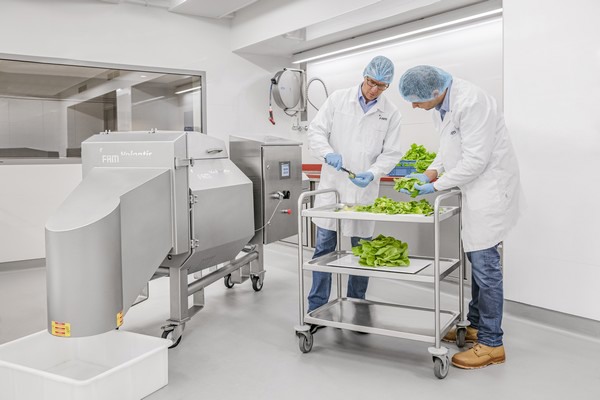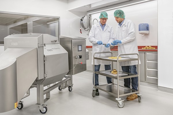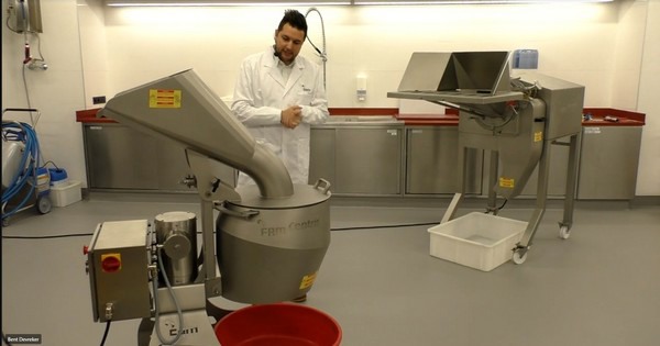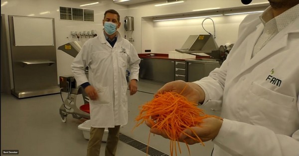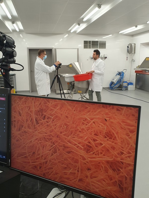 Detrás de las cámaras, Bent Devreker y Tim Van Win se preparan para una prueba de corte. En este caso, hay dos máquinas: la Centris y la Dorphy, una ralladora y una máquina troceadora de frutas y hortalizas. "Nos encontramos en el laboratorio, donde hemos estado ofreciendo pruebas de corte desde la fundación de FAM. Preferimos hacer las pruebas estando presentes los clientes, pero esto no ha sido posible desde hace año y medio", dice Bent. "Sin embargo, queremos seguir mostrando a los clientes de lo que son capaces nuestras máquinas y cómo se manejan". Por ello, FAM ha equipado su laboratorio con equipos audiovisuales profesionales para recorrer todo el proceso de corte junto con sus clientes.