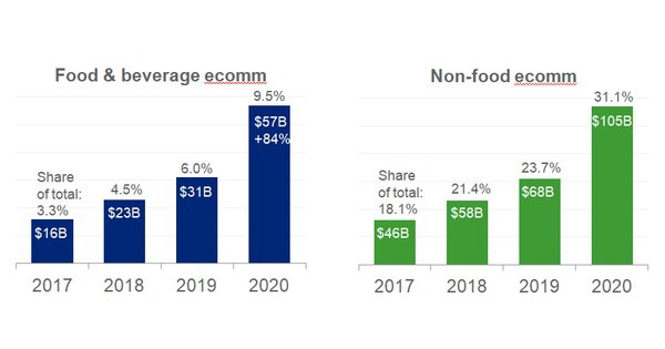 En 2017, la porción online de ventas de alimentos y bebidas en total fue del 3,3 por ciento. En 2017, había ascendido al 6 por ciento o 31.000 millones de dólares. Para finales de 2020, el comercio electrónico suponía el 9,5 por ciento de las ventas estadounidenses de alimentación y bebidas, lo cual reflejó un crecimiento anual del 84 por ciento, según IRI.