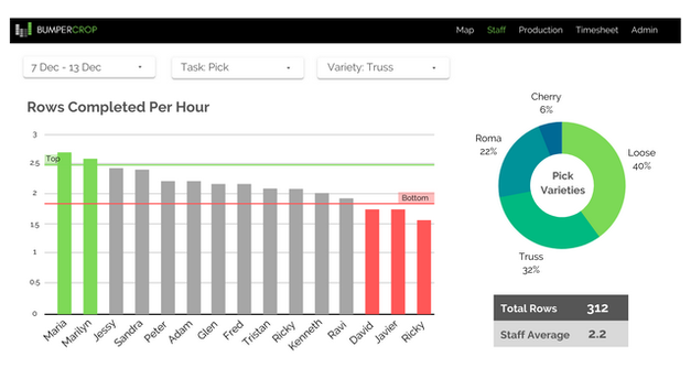 Los agricultores pueden hacer un seguimiento de sus operaciones a distancia desde su PC, teléfono inteligente o tableta, o compartir fácilmente los datos aprovechando la plataforma de datos abierta de BumperCrop. La plataforma se ha construido específicamente para la personalización, ya que las operaciones suelen tener procesos y terminología diferentes que deben tenerse en cuenta. "Por ejemplo, se dispone de diferentes informes, como el tiempo empleado en las hileras, el peso recogido o el número de arbustos completados. También se pueden asignar y actualizar sin problemas diferentes variedades en las hileras".