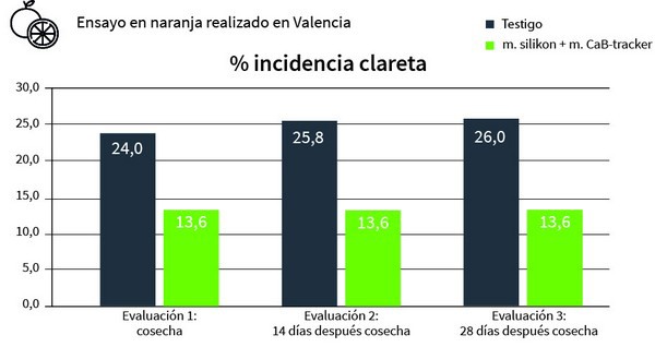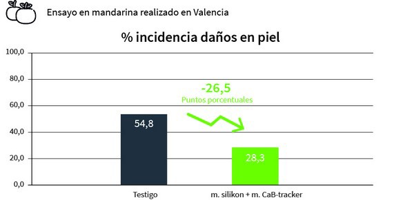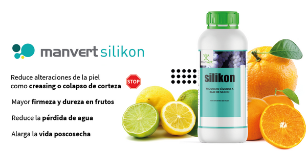 Aplicando manvert silikon y manvert CaB-tracker en cítricos se consiguen plantas con tejidos más resistentes, con mayor fuerza ante radiaciones solares, plantas más hidratadas y que sufren una menor pérdida de agua y un retraso en la senescencia de la piel de los frutos. Con ello, se logra reducir notablemente los problemas de alteraciones de la piel y también un mayor calibre y una mayor conservación de la fruta.