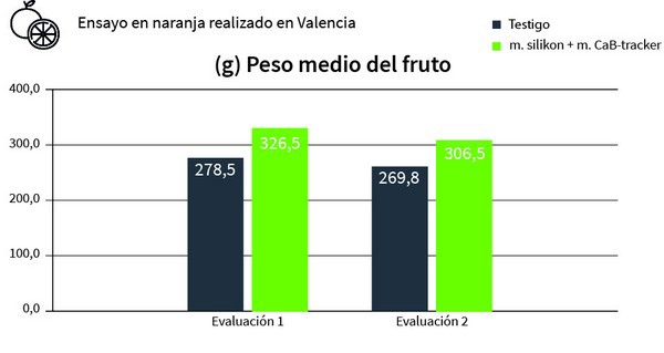 El resultado es un mayor rendimiento porque se reducen notablemente las mermas y se aumenta el calibre del fruto, como ya han podido comprobar muchos productores y como demuestran los ensayos que la compañía ha realizado a lo largo de numerosos años. Una muestra de ello está recogida en los siguientes gráficos: