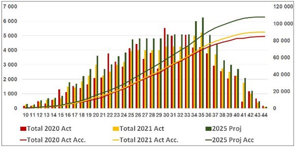Si se tiene en cuenta que la flota de buques frigoríficos convencionales está en rápido declive debido al desguace de buques, que supera con creces las nuevas construcciones, podría avecinarse el desastre. Suponiendo que continúe el estancamiento (o incluso descenso) del volumen de envíos de cítricos en buques frigoríficos convencionales, la demanda de contenedores frigoríficos podría incrementarse de las 85.000 unidades enviadas en 2020 a las 110.000 necesitadas en 2025, un enorme aumento del 30%.
