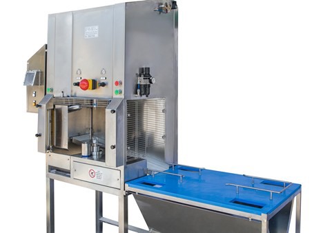 Es una máquina semiautomática, con carga manual, equipada con un cuadro eléctrico con dos inversores. Uno sirve para ajustar la velocidad de rotación de la calabaza y otro para regular la velocidad de la cuchilla. Un empleado carga la fruta en una posición preestablecida, pulsa el botón de inicio y comienza el procesamiento. La herramienta que pela la calabaza no necesita ser ajustada y sigue la forma, incluso si esta es irregular. La máquina puede pelar calabazas con una altura de hasta 400 mm y un diámetro de hasta 250 mm. Dependiendo del modelo elegido, la máquina puede pelar entre 4 y 28 calabazas por minuto.