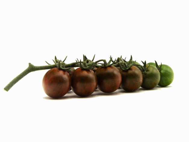 Un tomate cherry derivado de la variedad TOP Zmira, caracterizado por un calibre de aprox. 25-30 gramos. La piel veteada de color verde y rojo oscuro se distingue por un alto contenido en licopeno y carotenoides.