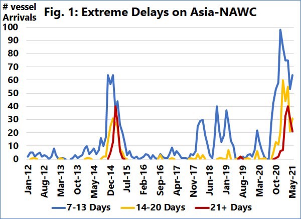 Como se puede observar en la figura 1, en la ruta Asia-Costa oeste de Norteamérica, en su pico, las llegadas con 7-13 y 14-20 días de retraso eran mayores que en la cima de la disputa laboral de 2015 en la costa oeste de Estados Unidos. De enero a mayo de 2021, la sorprendente cifra de 695 buques llegaron con un retraso de más de una semana, 343 de ellos con más de 14 días de retraso y 132 de ellos, con más de 21 días. En comparación, de enero de 2012 a diciembre de 2020, 1.535 llegadas se retrasaron más de una semana, 330 más de dos semanas y 104 más de 21 días.