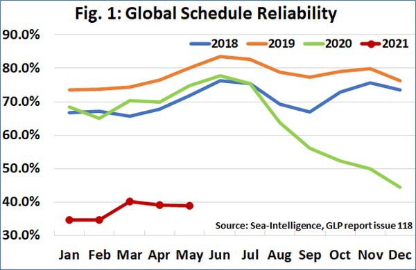 Sea-Intelligence ha publicado el número 118 del informe Global Liner Performance (GLP), con las cifras de la fiabilidad del calendario de navegación incluido el mes de mayo de 2021. Dado que el informe es bastante completo y abarca 34 rutas y más de 60 navieras, esta nota solo cubrirá los elementos destacados del informe.