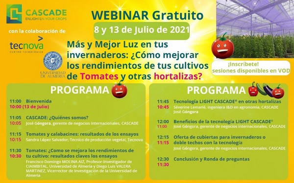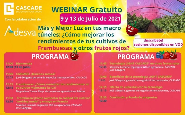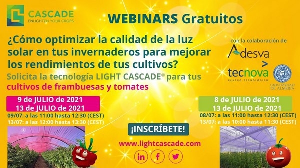 Cascade, empresa francesa líder en tecnología especializada en el desarrollo de formulaciones ópticas para diferentes tipos de cubiertas de macrotúneles, dobles techos y cubiertas de invernaderos, con unas características únicas del control de la luz, presentará su tecnología Light Cascade® durante 2 webinars gratuitos dedicados a los frutos rojos y a las hortalizas.