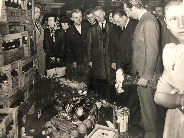 El abuelo Albert (vestido de negro) junto con el entonces príncipe Alberto de Bélgica (en traje gris, con flores) en el mercado mayorista de Bruselas en 1968. La niña de blanco es la madre de Cédric, Eliande De Ridder.